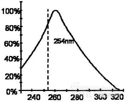 如圖所示,從圖中可以看出遺傳物質核酸DNA和RNA對紫外線吸收光譜的范圍為250-280nm,傳統低壓汞燈的發光譜線主要有254nm和185nm兩條,因此當UVLED燈波長為254nm時,核酸對紫外線有最大吸收,即殺菌效果最好。
